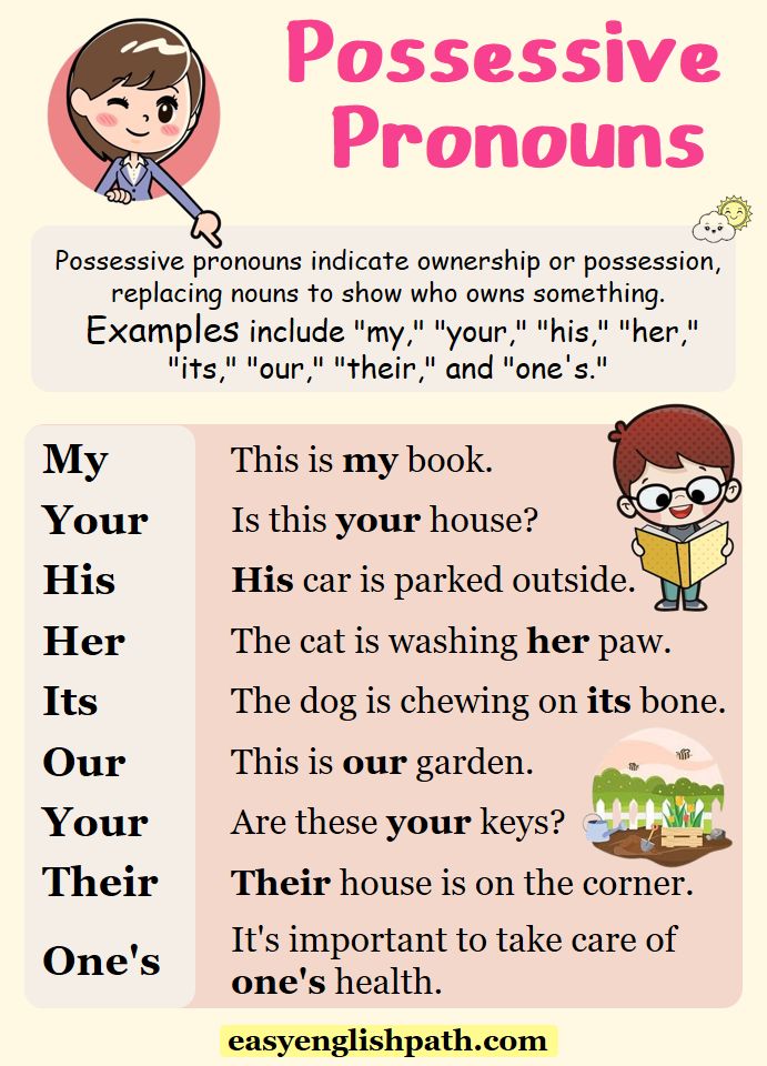 - Pronombres Posesivos (mine, yours, his, hers, its, ours, theirs) van después del verbo o al final de la frase, reemplazando al sustantivo: This pen is mine.